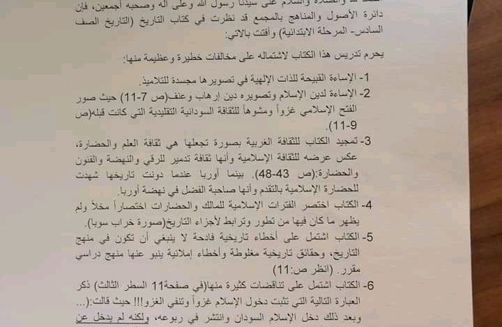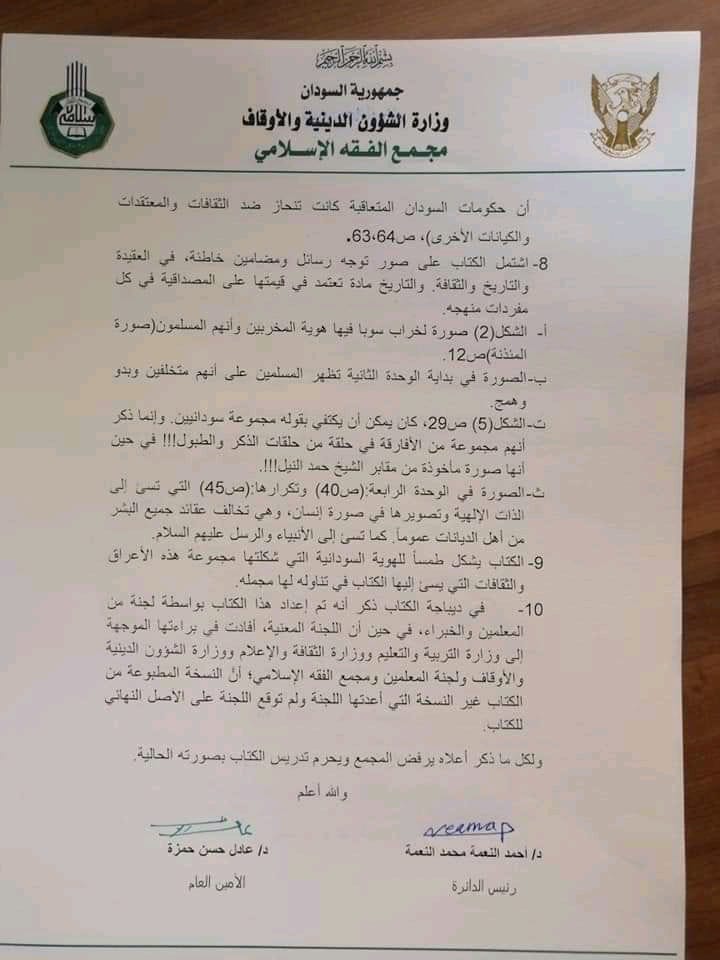 أصدر مجمع الفقه الإسلامي السوداني فتوى بتحريم تدريس كتاب التاريخ للصف السادس لاشتماله على مخالفات اعتبرها المجمع خطيرة وذلك بتجسيدها للذات الإلهية على هيئة بشر، وقد اثار محتوى الكتاب غضب واسع بالشارع السوداني وردود أفعال ساخطة خاصة على مدير المناهج المسؤول د. القراي