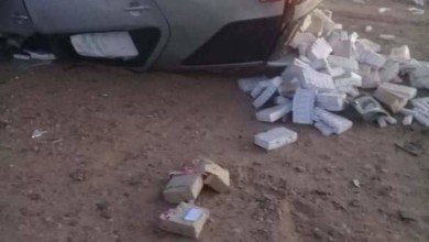 بالصورة : انقلاب سيارة محملة بكميات كبيرة من الكريمات الحارقة مهربة بمنطقة الشهيناب